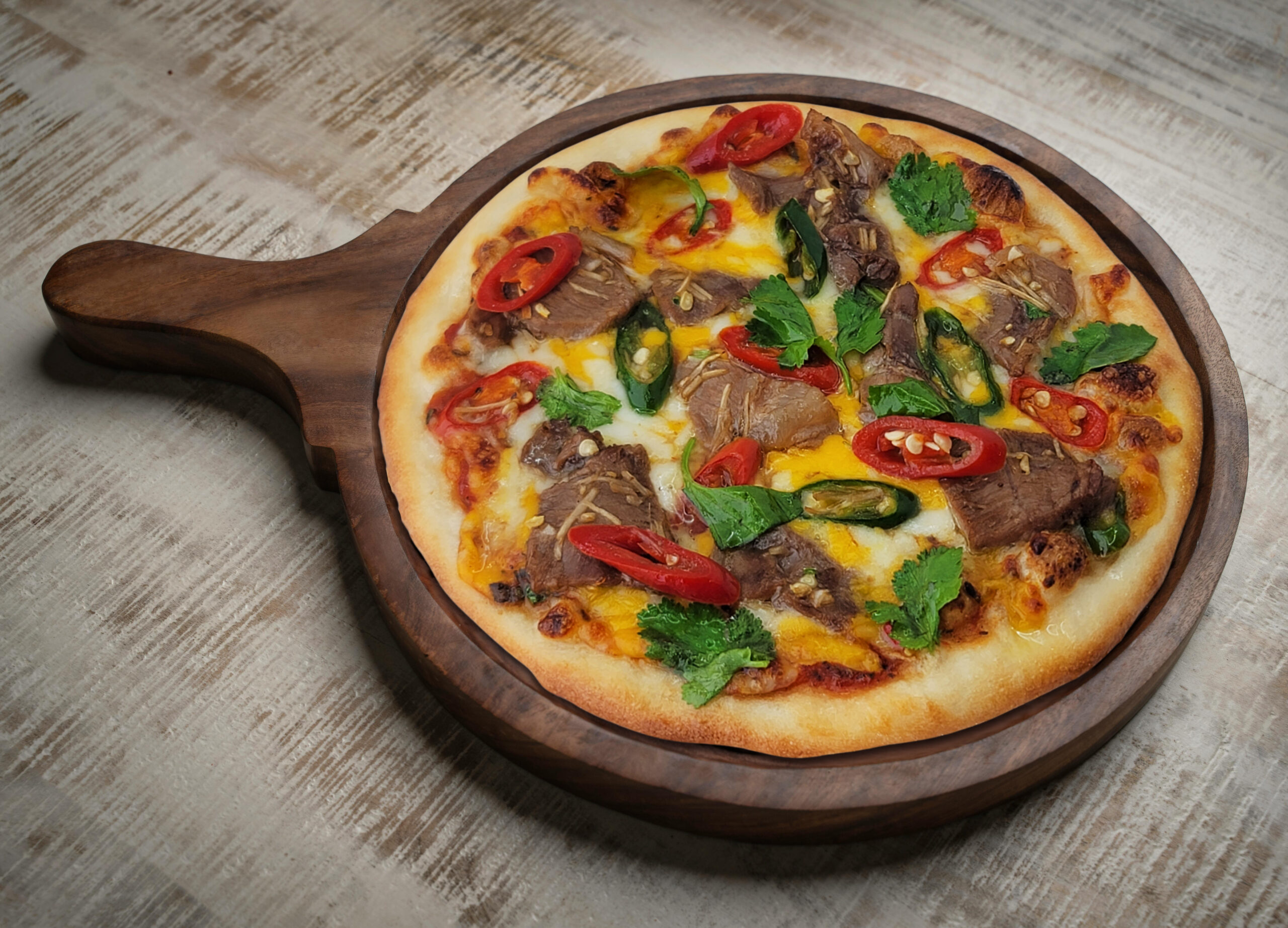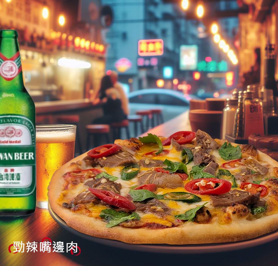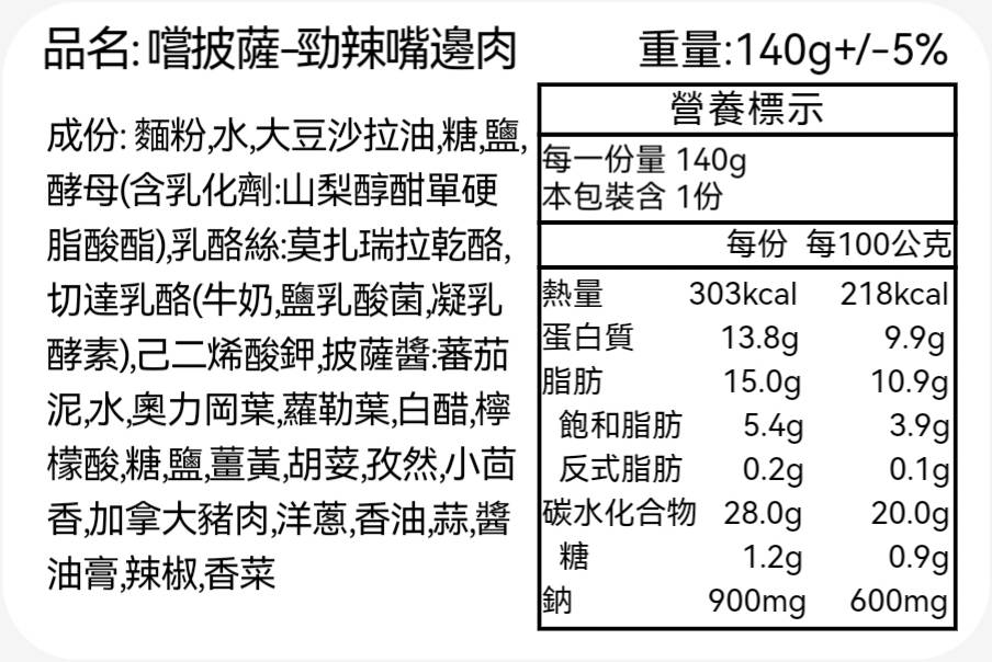 餅皮:麵粉、水、大豆沙拉油、糖、鹽、酵母[ 含乳化劑:山梨醇酐單硬脂酸酯)、乳酪絲:莫扎瑞拉乾酪、切達乳酪(牛奶、鹽乳酸菌、凝乳酵素)、己二烯酸鉀、披薩醬:蕃茄泥、水、白醋、奧力岡葉、蘿勒葉、檸檬酸、糖、鹽、薑黃、胡荽、孜然、小茴香、加拿大豬肉、洋蔥、香油、蒜、醬油膏、辣椒、香菜