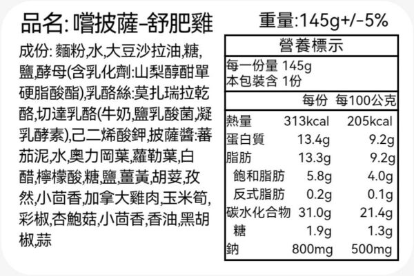 餅皮:麵粉、水、大豆沙拉油、糖、鹽、酵母[ 含乳化劑:山梨醇酐單硬脂酸酯)、乳酪絲:莫扎瑞拉乾酪、切達乳酪(牛奶、鹽乳酸菌、凝乳酵素)、己二烯酸鉀、披薩醬:蕃茄泥、水、白醋、奧力岡葉、蘿勒葉、檸檬酸、糖、鹽、薑黃、胡荽、孜然、小茴香、加拿大雞肉、玉米筍、彩椒、杏鮑菇、小茴香、香油、黑胡椒、蒜